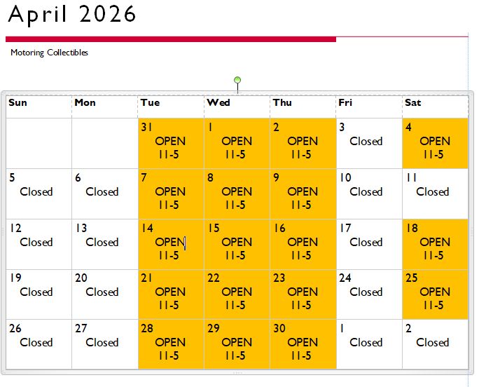 Below is the calendar of our days and hours open for the next couple of months. All times are Pacific Time Zone.